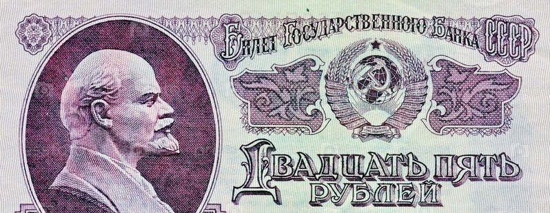 Фрагмент лицевой стороны 25-рублевой бумажной купюры (1961 г.) СССР с изображением Владимира Ленина (Ульянова, 1870-1924), с надписью "Двадцать пять рублей, Билет Госбанка СССР"