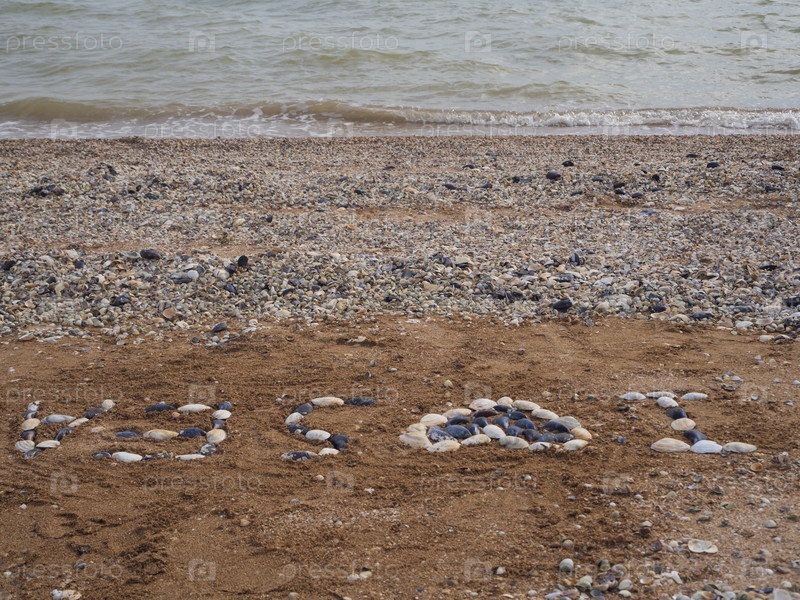 Надпись на пляже-я люблю море с символом любви-сердцем. На морском песчано-ракушечном пляже Текст и сердце выложены ракушками, На фоне воды и ракушек