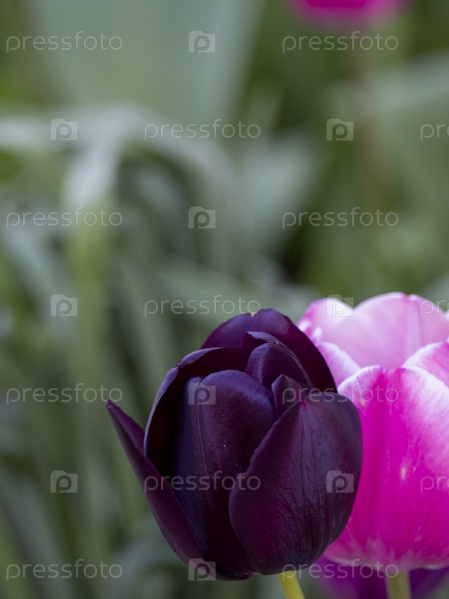 Фиолетовые и розовые тюльпаны крупным планом на фоне зелени в весеннем саду