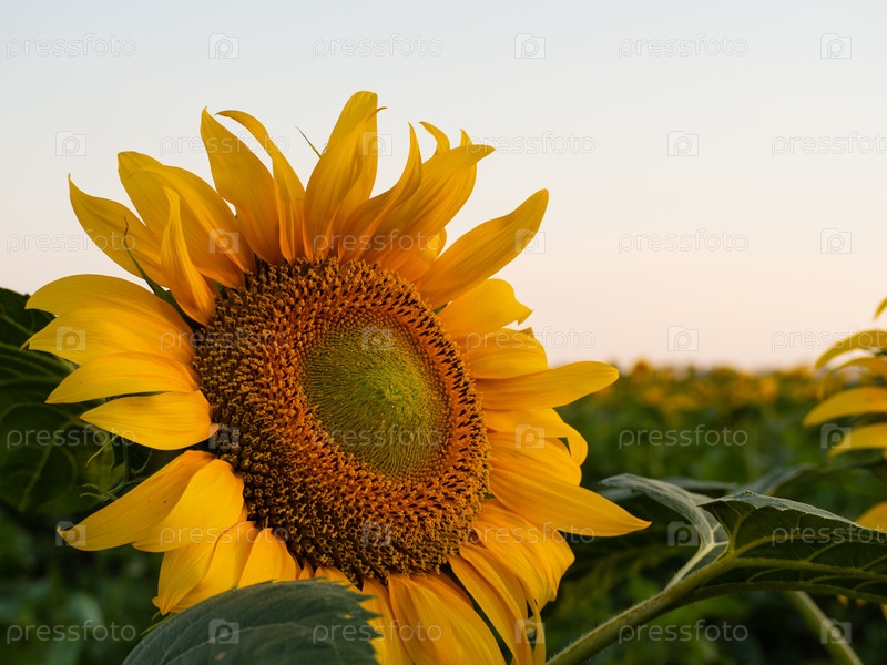Открытка с красивым ярко-желтым подсолнухом на поле