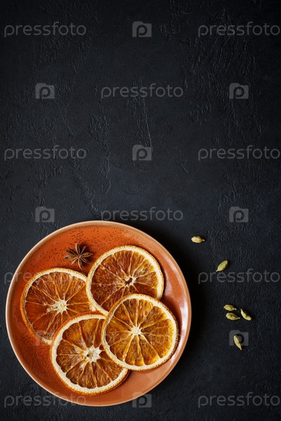 Тарелка с сушеными дольками апельсина с баджаном и кардамоном на черном сланцевом фоне с копией пространства