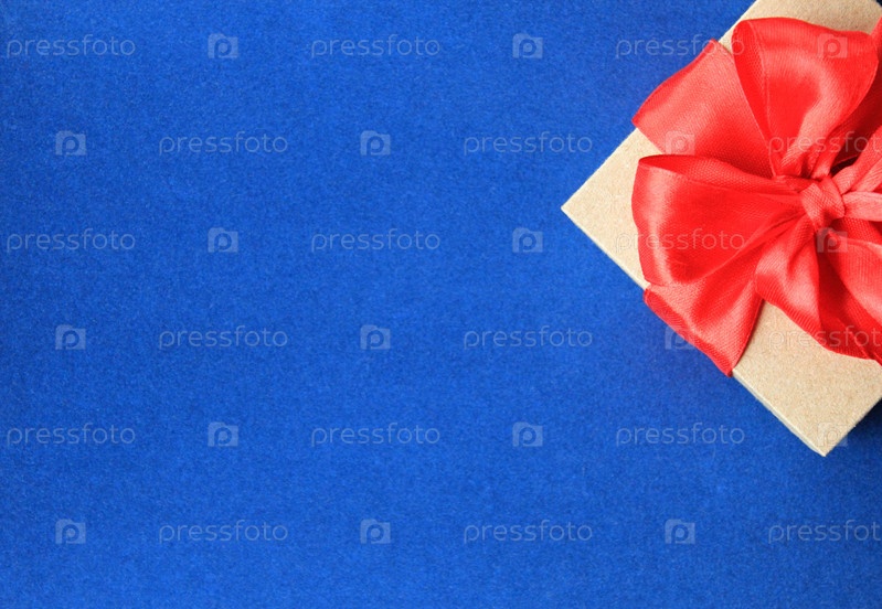 Вид сверху на завернутую подарочную коробку с красной лентой на синем фоне