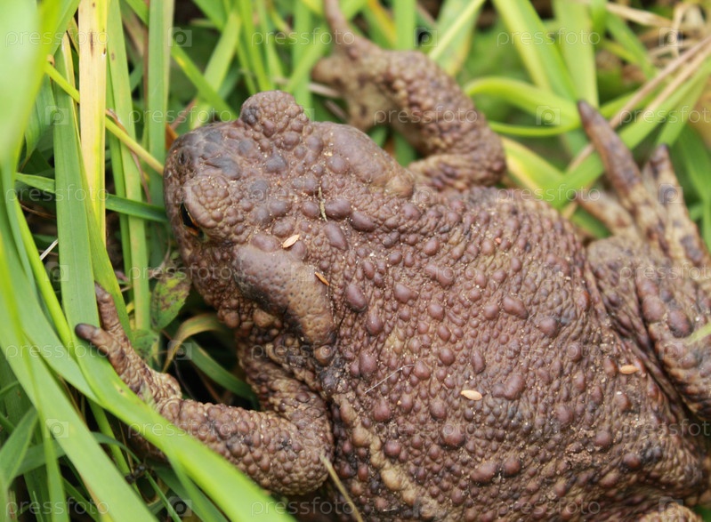 Большая лягушка сидит на зеленой траве в летний день