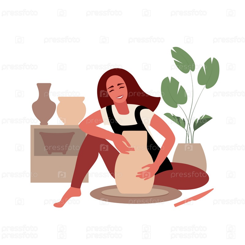 Гончарная мастерская. Гончар-керамист с плоской цветовой векторной иллюстрацией. Счастливая женщина в фартуке делает вазу ручной работы. Девушка-ремесленник, работающая с гончарным кругом. Профессия, хобби