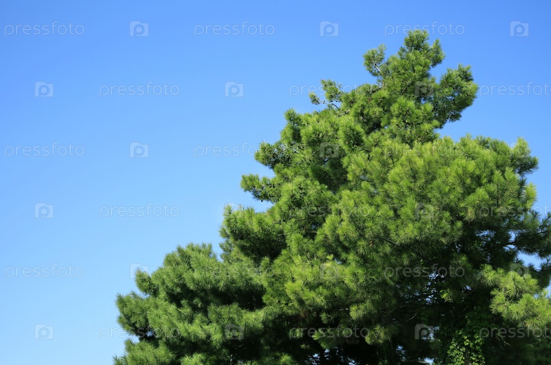Ель, хвойное дерево на фоне голубого неба