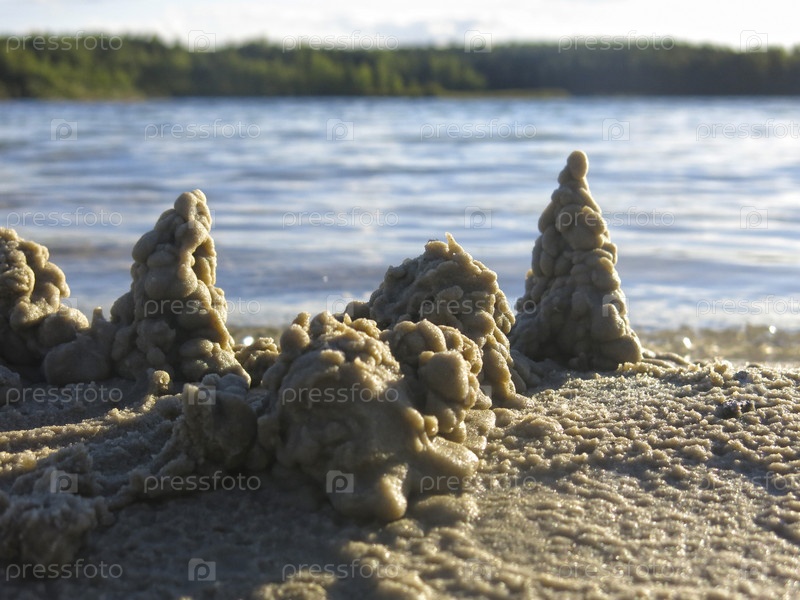 Песочные футуристические фигуры у воды на берегу тихого озера