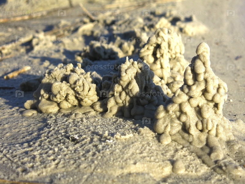 Песочные футуристические фигуры у воды на берегу тихого озера