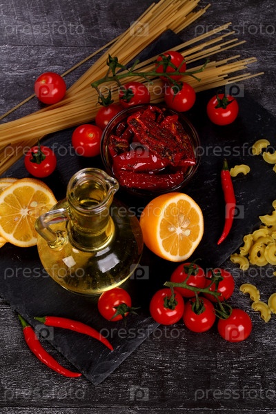 Вяленые помидоры, овощи и паста на черном фоне