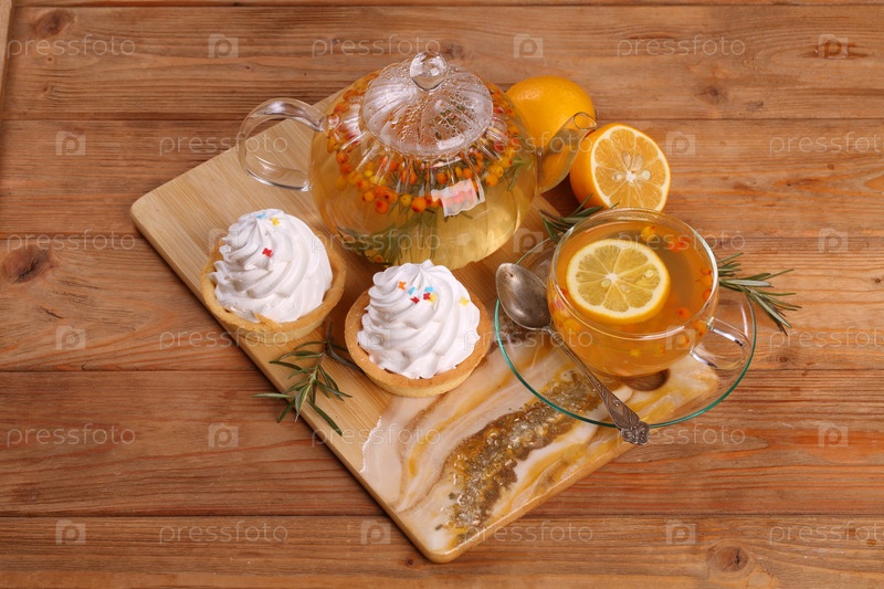 Облепиховый чай с пирожным на деревянном столе