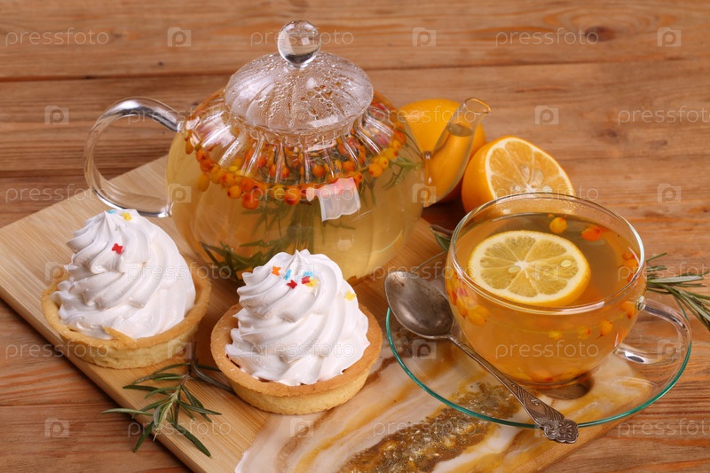 Облепиховый чай с пирожным на деревянном столе