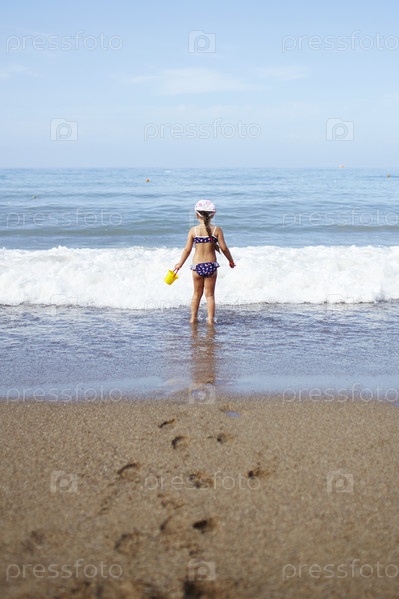 Маленькая девочка с ведром в руках стоит на берегу моря