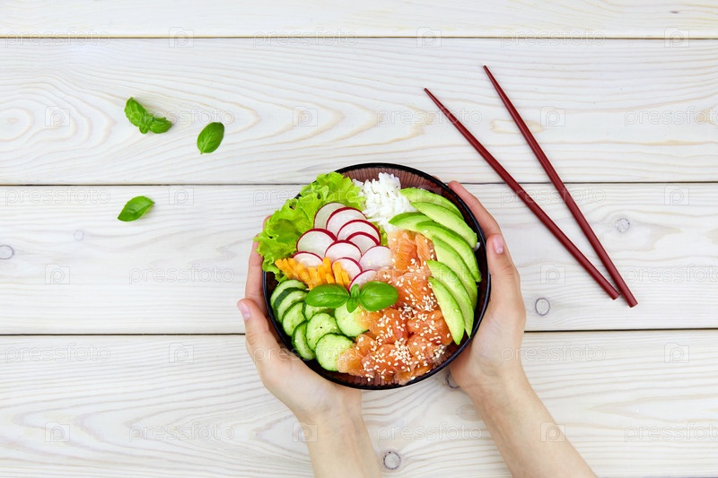 Поке боул с лососем, рисом, редисом, морковью, огурцом. Гавайский ахи в руках женщины. Диетическое блюдо с рыбой