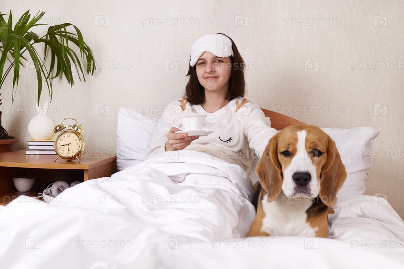 Милая девочка-подросток со своим псом-биглем лежит в постели под одеялом