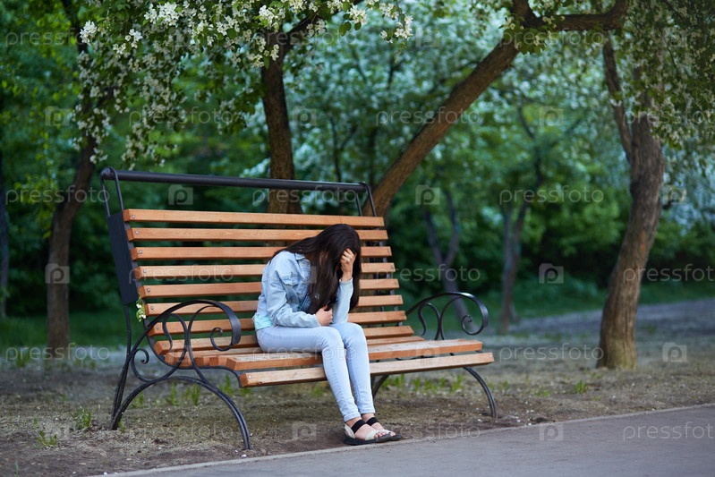 Расстроенная грустная девочка-подросток сидит на скамейке в парке, держась за голову, закрыв лицо