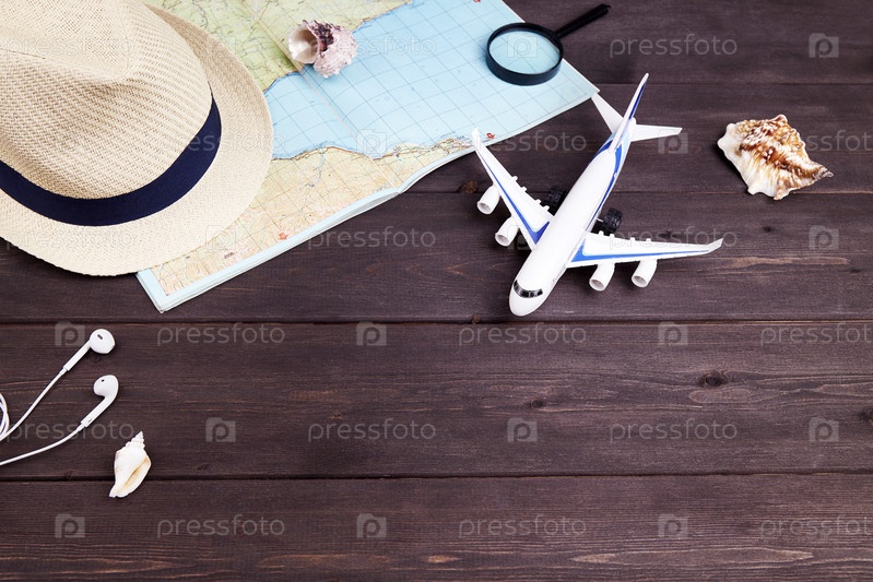 Аксессуары для путешественника на темном деревянном фоне