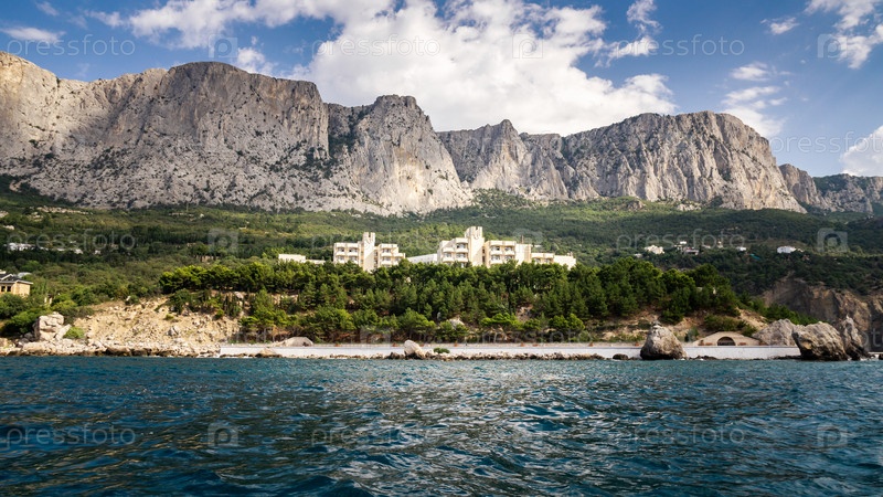 Панорама Форосского парка на фоне крымских гор в зеленом лесу