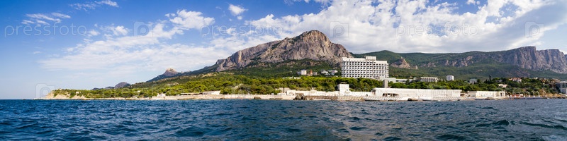Панорама Форосского парка на фоне крымских гор в зеленом лесу