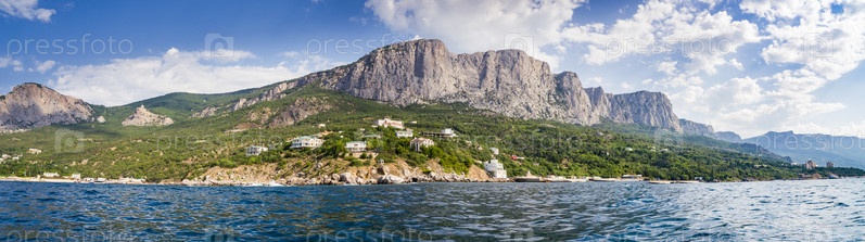 Панорама Форосского парка на фоне крымских гор в зеленом лесу