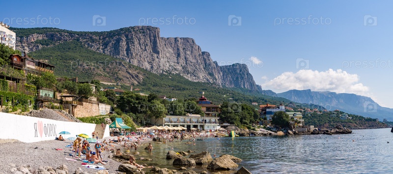 Панорама Зеленого пляжа в центральной части поселка Форос с отдыхающими