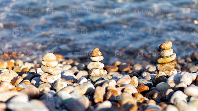 Пирамида из камней на красочном покрытии из гальки на пляже