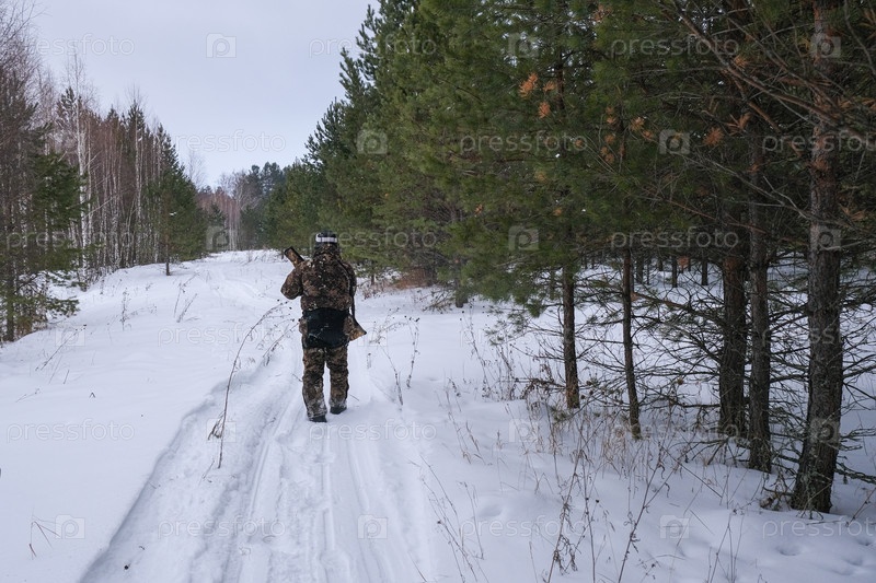 Охотник с ружьем в зимнем лесу