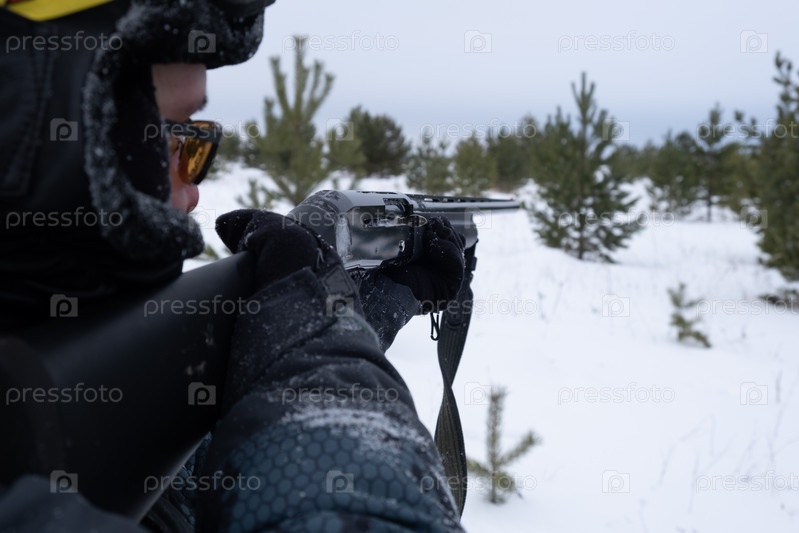 Охотник с ружьем в зимнем лесу