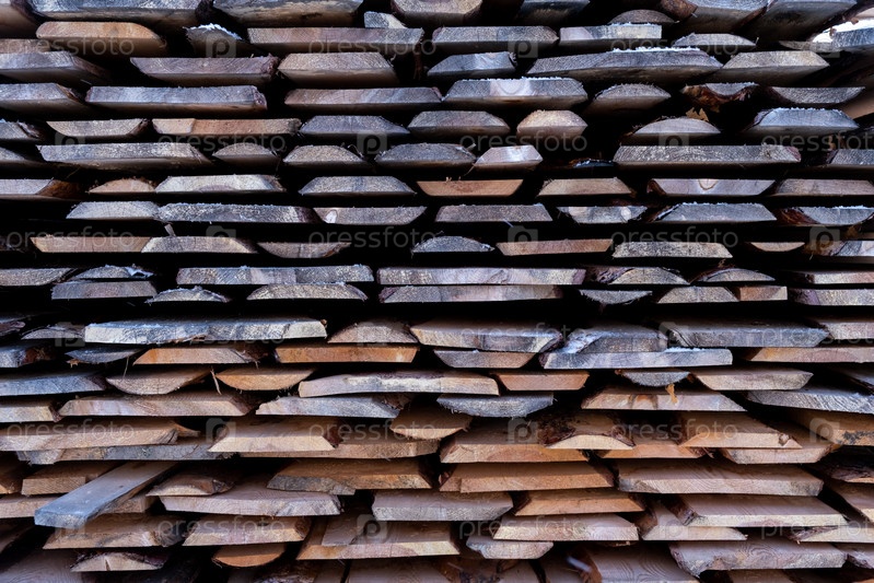 Стопка обработанных досок зимой стоит на улице