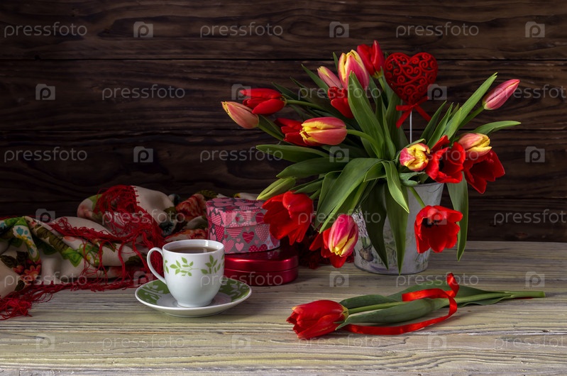 Праздничные тюльпаны на деревянном фоне