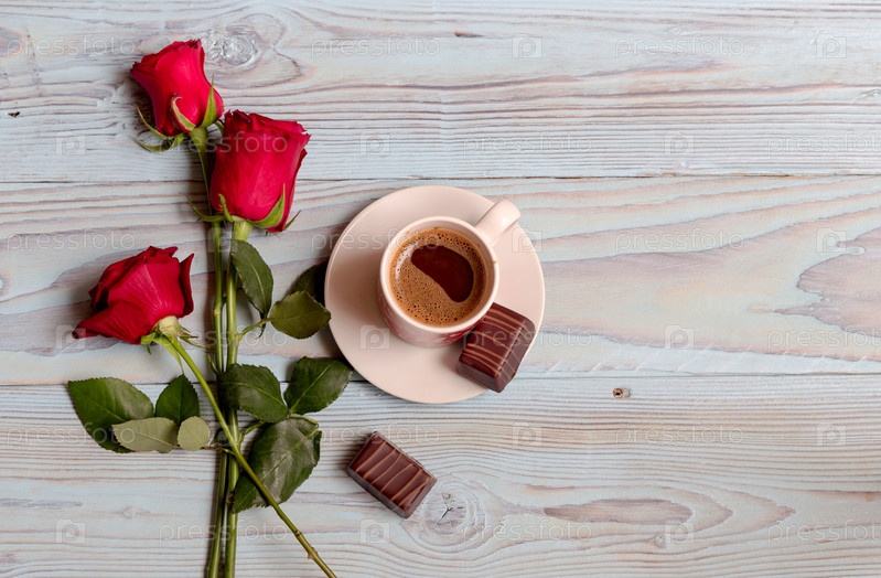Чашка кофе, конфеты и розы