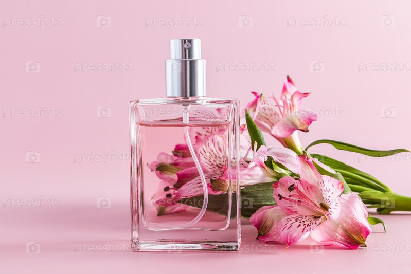 Элегантный стеклянный флакон женских духов или туалетной воды на фоне свежей астромерии. презентация аромата. розовый фон. передний план