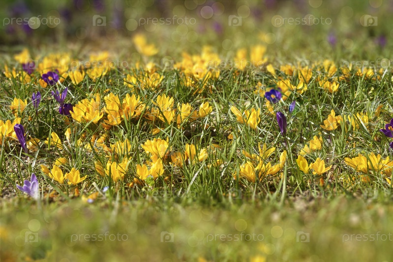 Желтый крокус,шафран цветет на большом лугу