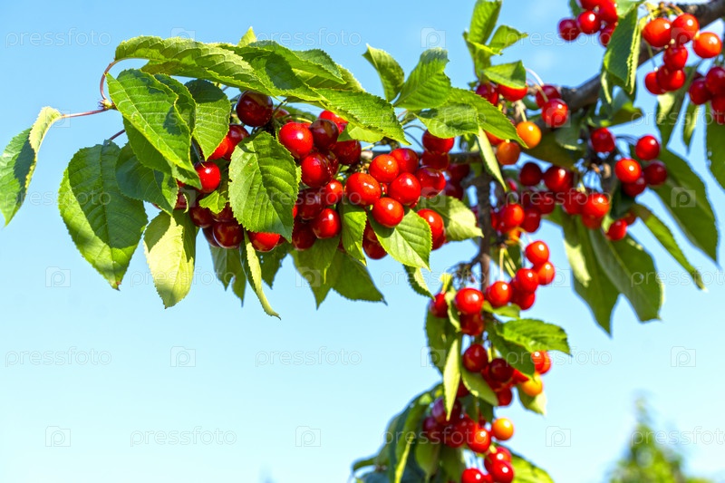 Ветки с плодами красной вишни на фоне голубого неба