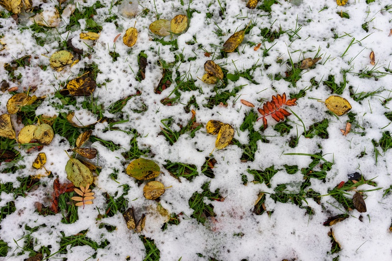 Естественный фон с желтыми и красными листьями на снегу
