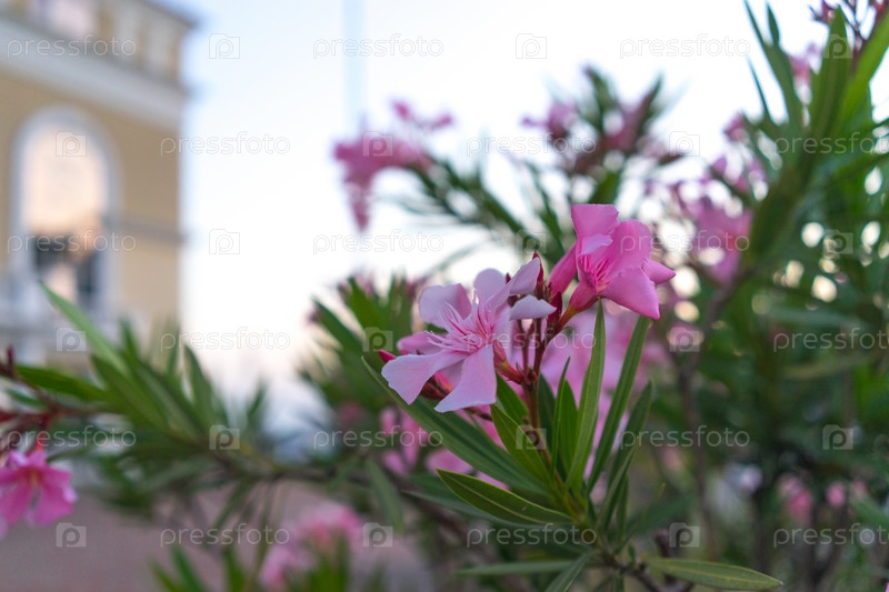 Розовые цветы олеандра на размытом городском фоне