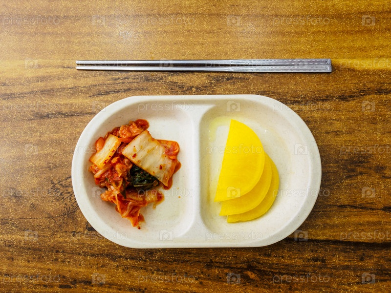 Вид сверху на тарелку с кимчи и редисом, традиционной корейской ферментированной пищей. Сеул, Южная Корея