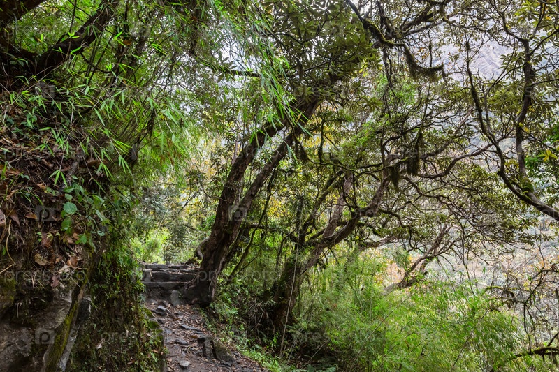 Каменная тропинка в зеленых тропических джунглях. Тропический лес в Непале, Гималаи