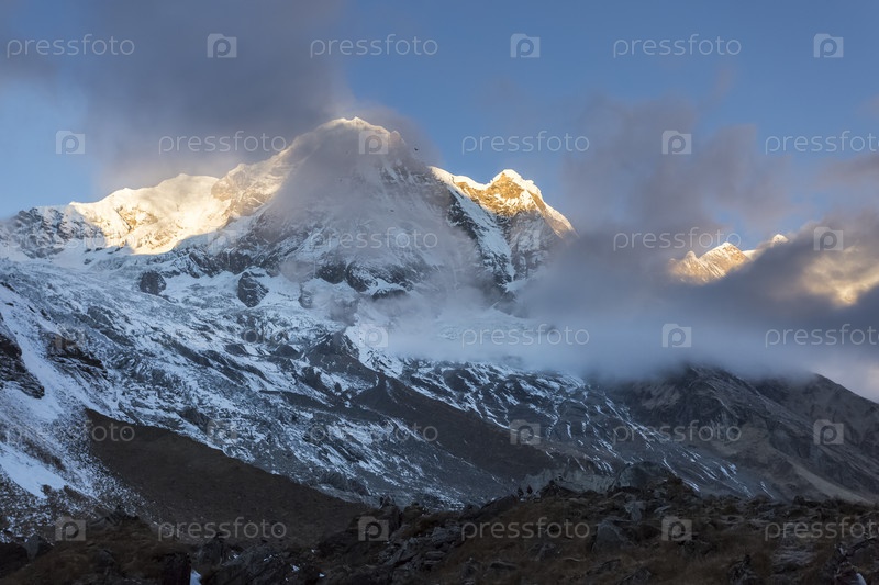Первые солнечные лучи, освещающие вершину горы Аннапурна Юг, Гималаи, Непал