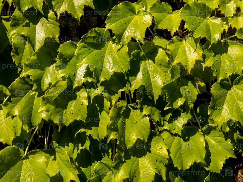 Зеленые виноградные листья с каплями дождя на солнце. Шаблон естественного летнего фона