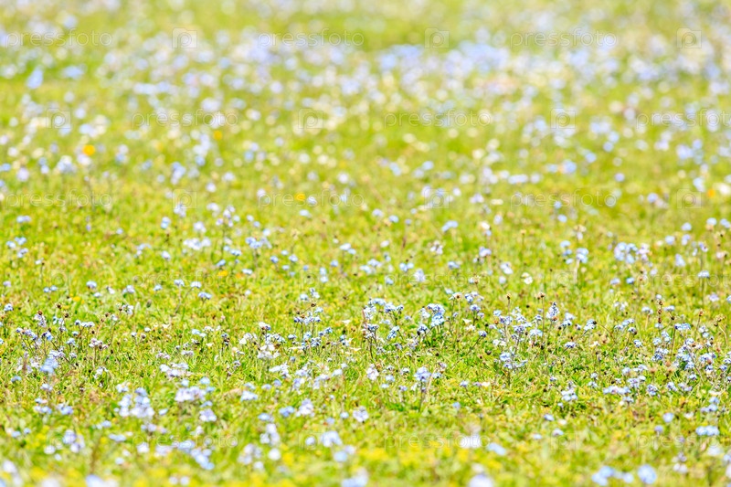 Голубые незабудки цветы на лугу на природе на зеленом фоне. Цветочный летний весенний цветочный фон. Свободное пространство для копирования, выборочный фокус