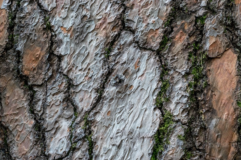 Натуральная текстура рельефной коры сосны с небольшими вкраплениями зеленого мха
