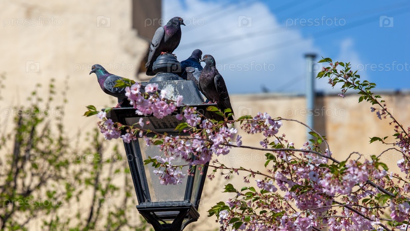 Ветка сакуры на фоне голубей на фонаре