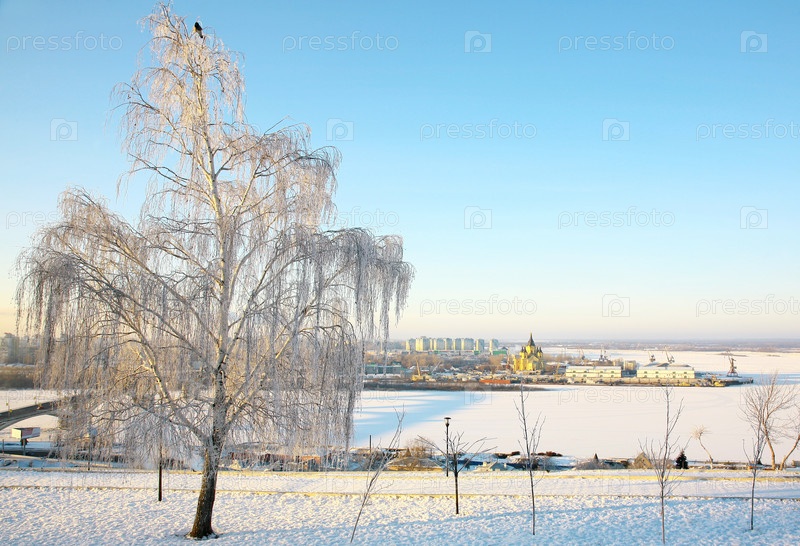 Заснеженная береза на набережной Федоровского в трескучий мороз. Нижний Новгород