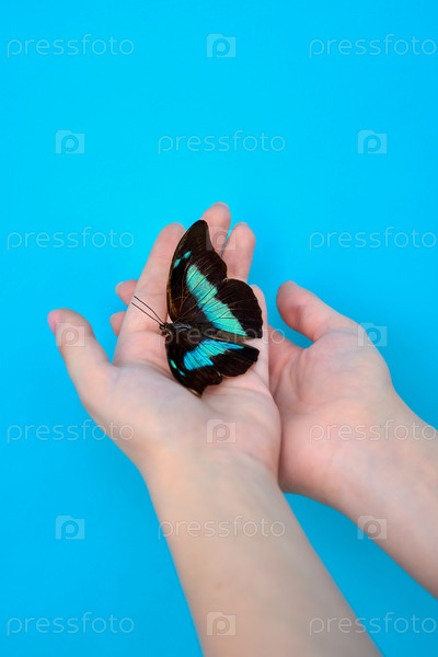 Крупный план голубой бабочки на плече молодой девушки на темном фоне. Понятие о красоте и хрупкости природы