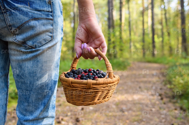 Корзина с дикими ягодами в руке на фоне леса. Полная корзина лесных ягод брусники и черники