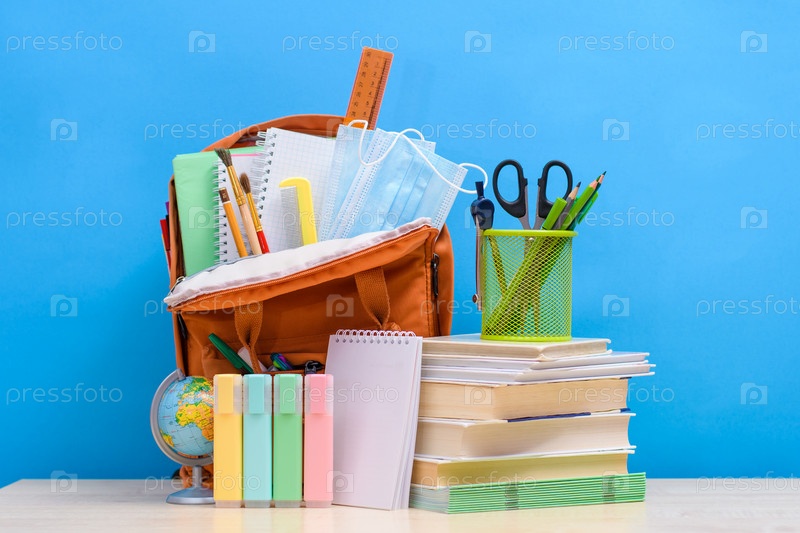 Подготовка детей к школе. Школьные принадлежности и учебники рядом с полным школьным рюкзаком на синем фоне