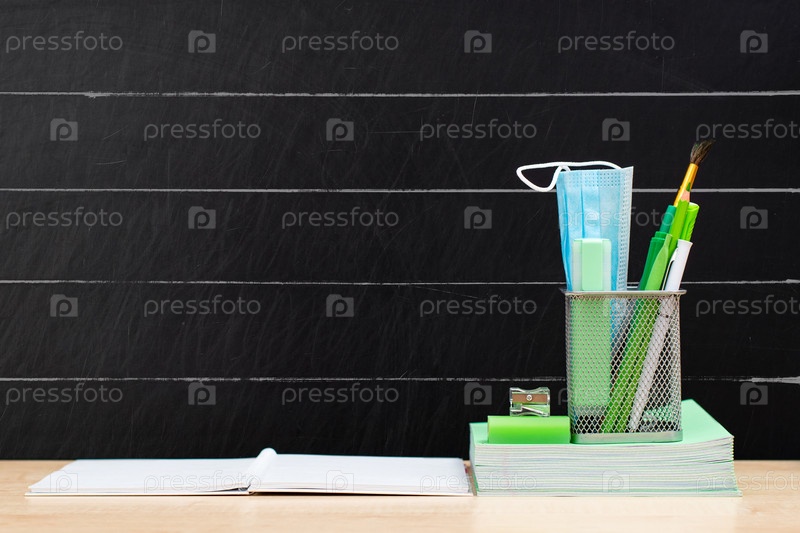 Школьные принадлежности с медицинской маской лежат на столе рядом с доской. Есть свободное место для текста на школьную тему