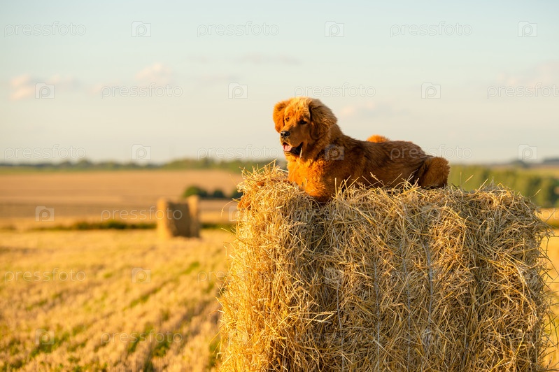 Рыжий щенок породы тибетский мастиф лежит на стоге сена. На заднем плане поле. Щенок лежит на закате