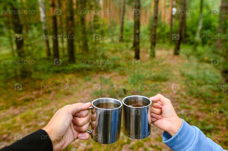 Супружеская пара на пикнике в лесу держит кружки с горячим чаем. Занятия на улице. Избирательный фокус на мужской руке