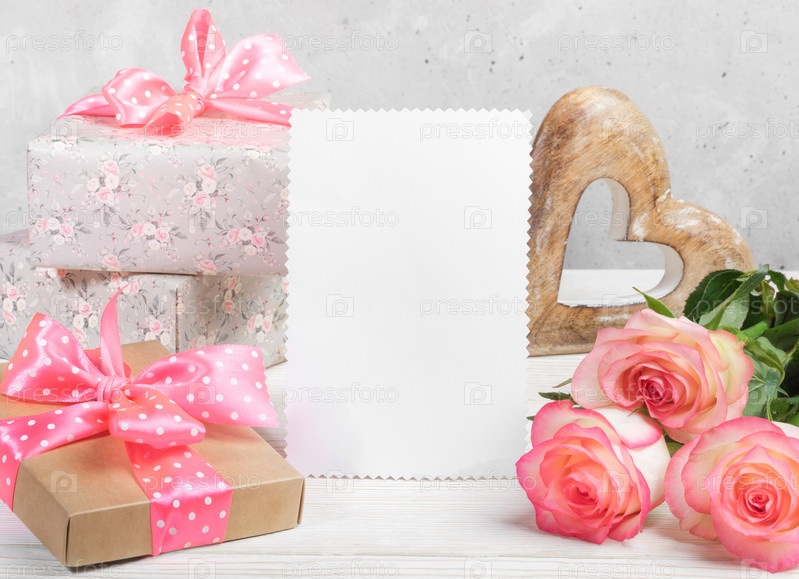 Праздничная композиция. Подарочные коробки с розовыми лентами, розы персикового цвета, деревянное сердце, пустая белая заготовка для текста на светлом нейтральном фоне. День святого Валентина, день матери, свадебная открытка