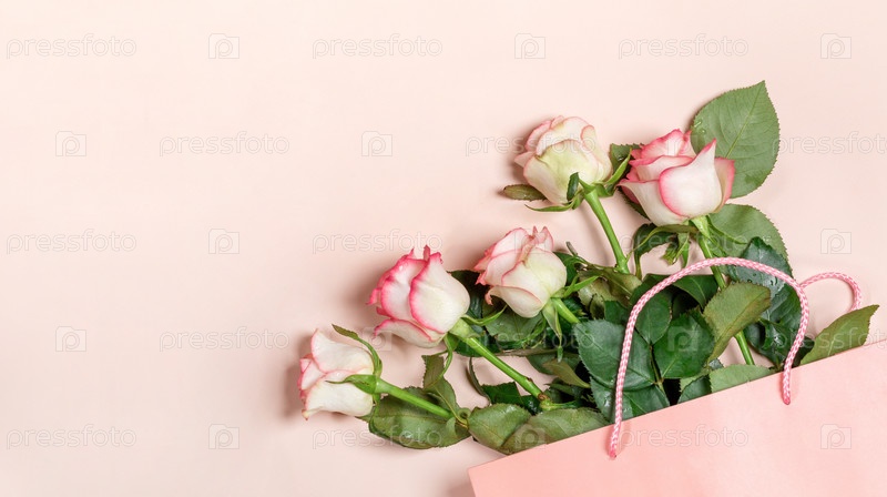 Розовые нежные розы в розовой бумажной упаковке на бледно-пастельно-розовом фоне. Баннер. Копировать пространство